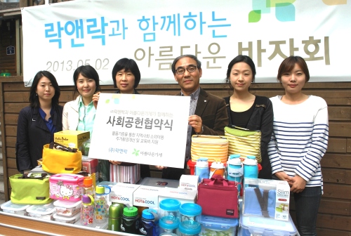 락앤락은 최근 아름다운가게와 연간 물품기증에 관한 나눔협약을 맺었다. 아름다운가게 안국·미아점에서 ‘락앤락과 함께하는 아름다운 바자회’를 개최한다는 게 회사측 설명이다. 사진은 이경숙(왼쪽에서 세번째) 락앤락 이사와 김수열(오른쪽에서 세번째) 아름다운가게 사무처장이 협약식 후 포즈를 취하고 있는 모습.