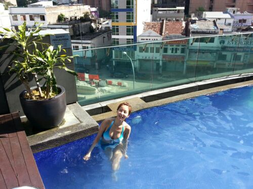 김정민은 비키니 수영복 룩에 대해 “다른 연애인들 다하길래 해봤는데 이렇게 저가호텔 옥상 수영장에서 찍은건 내가 첨일듯~~ 화장도 안하고 완전 쌩얼임”이라는 솔직한 느낌을 전했다.