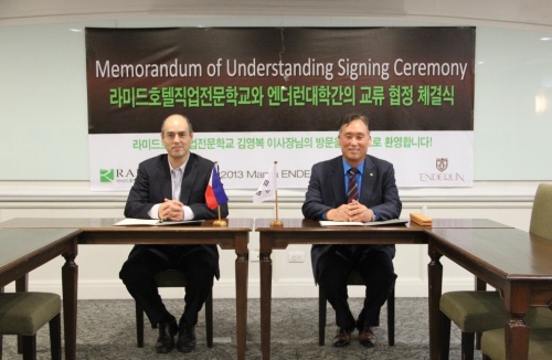 이 협약식은 라미드호텔전문학교 김영복(사진 오른쪽) 이사장과 앤드런컬리지 이사장, 그 외 학교 관계자들이 참석한 가운데 진행됐으며, 교류를 통한 양 기관의 교육 및 연구 활동 강화와 교수, 학생들간 상호이해관계 촉진을 목적으로 체결됐다.