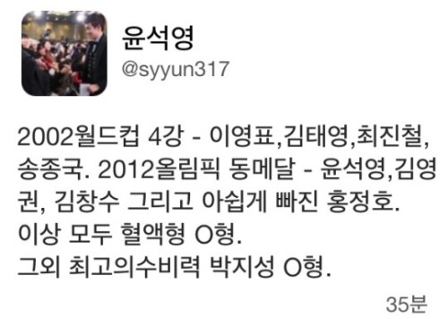 이런 가운데 윤석영이 3일 올린 트위터 글도 이런 상황에 불을 붙였다. 윤석영은 “2002월드컵 4강-이영표, 김태영, 최진철, 송종국. 2012올림픽 동메달-윤석영, 김영권, 김창수, 그리고 아쉽게 빠진 홍정호. 이상 모두 혈액형 O형. 그외 최고의 수비력 박지성 O형’이라는 글을 남겼다. 최강희 감독이 인터뷰에서 혈액형으로 선수의 성격을 파악할 수 있다고 한 것에 대한 반응인 것으로 보인다. 최강희 감독은 “O형은 성격은 좋지만 덜렁거리고 종종 집중력을 잃는다”고 했다.