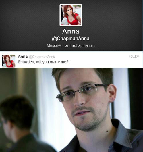 지난 2010년 미국에서 추방된 미모의 러시아 스파이 안나 채프먼(31)이 미국 국가안보국(NSA)의 기밀 감시 프로그램을 폭로한 에드워드 스노든에게 공개 구혼했다.