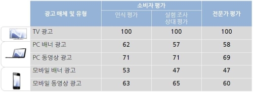 ‘광고기억도, 브랜드기억도, 광고유형선호도, 메시지 전달력, 제품/브랜드 구매영향력’ 등 5가지 항목이 반영된 광고 유형별 영향력은 TV광고를 100으로 봤을 때 TV>PC 동영상>모바일 동영상>PC 배너>모바일 배너 순으로 나타나 여전히 TV 광고의 영향력이 가장 큰 가운데 PC와 모바일 동영상 광고의 영향력이 점차 증가하고 있음을 확인시켜 줬다.