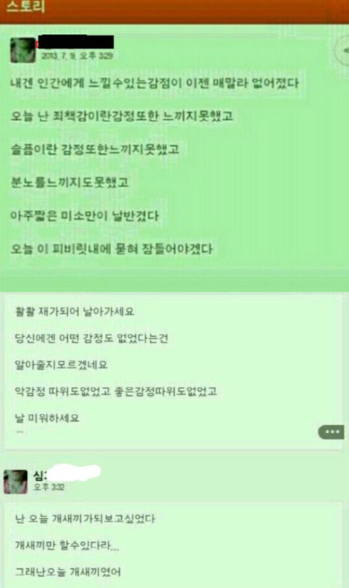 심 군은 "내겐 인간에게 느낄 수 있는 감정이 이제 메말라 없어졌다"며 "오늘 난 죄책감이란 감정 또한 느끼지 못했고 슬픔이란 감정 또한 느끼지 못했고 분노를 느끼지도 모했고 아주 짧은 미소만이 날 반겼다. 오늘 이 피비릿내에 묻혀 잠들어야겠다"는 글을 올렸다.