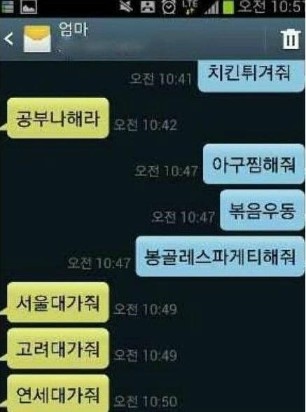 공개된 사진 속에는 엄마와 자녀 간에 나눈 메신저 대화 내용이 담겨있다.자세히 들여다보면, 고등학생으로 보이는 자녀가 엄마에게 “치킨튀겨줘”라고 말을 걸자 엄마는 “공부나해라”라고 무심하게 대답한다.