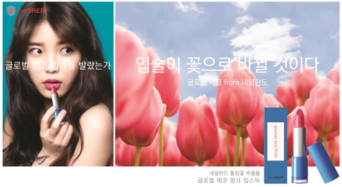 립스틱 화보도 인기다. 더샘 모델 아이유는 ‘글로벌 에코 핑크 립스틱’ 화보를 통해, 순수·순결의 상징인 핑크 색상으로 사랑스럽고 순수한 소녀의 느낌을 연출했다. 또 드라마 ‘최고다 이순신’에서 이 제품을 사용해 ‘아이유 립스틱’이라는 별칭까지 얻었다. ‘글로벌 에코 핑크 립스틱’은 피부에 자연 보호막을 형성해 수분 증발을 막고 풍부한 보습을 부여하는 아몬드·아르간·로즈힙·포도씨 4가지 오일이 함유된 모이스처 립스틱. 특히 여성을 가장 아름답게 표현해주는 핑크 색상으로 발색이 뛰어나며, 가볍고 밀착력이 뛰어난 사용감을 지녔다는 게 회사측 설명이다.