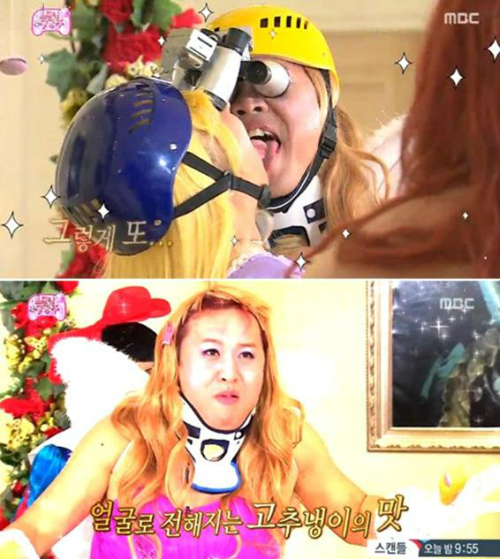 하지만 쌍안경과 헬멧을 쓴 탓에 과자를 찾는 일은 매우 어려웠고, 정준하와 박명수는 혀를 내밀며 혼신의 힘을 다해 과자를 찾았다. 그 때 가까이 있던 두 사람이 서로 키스를 할 뻔한 일이 발생해 모두가 경악했고 이를 보는 안방극장은 폭소했다.