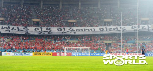 축구협회와 약간의 실랑이가 있었고, 붉은 악마는 SNS(소셜내트워크서비스)를 통해 '붉은 악마 서울지부는 동아시안컵 한일전 후반전 응원을 보이콧합니다. 이유는 대한축구협회가 위 걸개를 지속적으로 강제 철거하기에 더 이상 대표팀을 응원할 수 없습니다'라는 공식입장을 밝혔다.