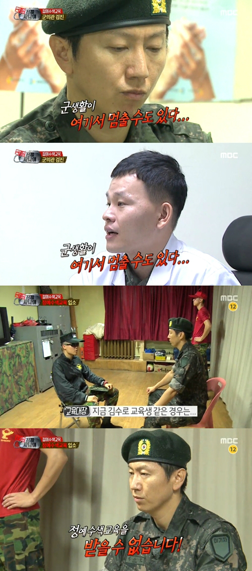 이날 이기자부대 전입을 앞두고 유난히 기대감을 드러냈던 김수로는 전입 첫 날 군의관으로부터 퇴소를 권유받았다. 멤버들은 정예수색교육에 앞서 건강진단을 했다. 군의관은 “김수로는 괜찮다고 말하지만 참는 게 눈에 보인다. 어깨가 완전 파열이 될 수도 있다. 퇴소를 권한다. 군 생활이 여기서 종료될 수도 있다”라고 김수로의 상태를 진단했다.