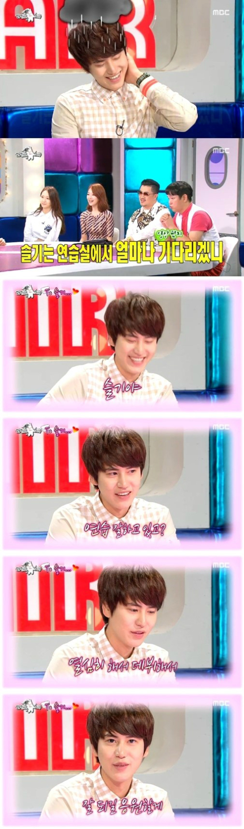크리스탈고 설리는 이를 듣자마자 같은 소속사인 SM 엔터테인먼트 슬기를 언급했고 규현은 "슬기도 괜찮지"라며 은근슬쩍 사심을 고백했다.