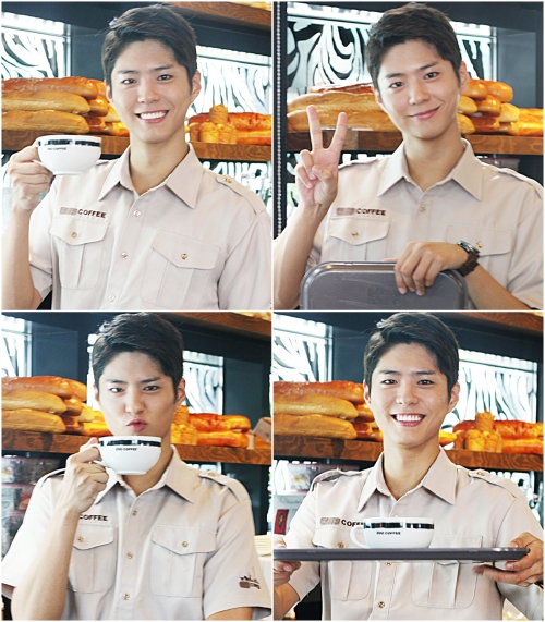 사진 속 박보검은 카메라를 향해 미소와 함께 브이를 지어 보이는가 하면 쟁반을 들고 함박 웃음을 짓거나 커피 잔을 든 채 커피를 권하는 듯한 포즈를 취해 ‘러블리 바리스타’라는 애칭에 걸맞은 모습으로 여성 팬들의 마음을 사르르 녹이고 있다.