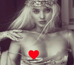 해당 사진은 미란다 커의 '브이매거진' 가을 호 화보로 과감한 노출로 절정의 섹시미를 선보이고 있다. 흑백사진인데다 귀여운 하트 스티커를 붙여 주요부위를 가려놨지만 감출 수 없는 풍만한 가슴라인과 미란다 커에게서 풍겨져 나오는 섹시 아우라가 시선을 사로잡는다. 특히 강렬한 그녀의 눈빛과 화관을 쓴 채 풀어헤친 긴 생머리가 묘한 분위기를 자아내며 남심을 흔든다.