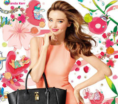 몸매가 그대로 드러나는 오렌지 컬러의 원피스에 블랙 컬러의 토트백을 매치한 미란다 커는 꽃밭을 연상시키는 일러스트 안에서 사랑스러운 미소를 선보이고 있다.
