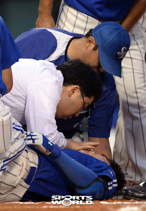 [SW포토]배영섭, 부상은 안돼! 기사입력 2013-09-08 19:06:42 기사수정 2013-09-08 19:06:42 글씨 크기 선택 가장 작은 크기 글자 한 단계 작은 크기 글자 기본 크기 글자 한 단계 큰 크기 글자 가장 큰 크기 글자 프로야구 삼성의 배영섭(아래)이 8일 잠실구장에서 열린 LG와의 경기 6회초 무사 1루 상대 투수 리즈의 투구에 맞고 부상을 당해 의사가 상태를 살피고 있다. 잠실=김두홍 기자 kimdh@sportsworldi.com 2013.09.08 [ⓒ 세계비즈앤스포츠월드 & sportsworldi.com, 무단전재 및 재배포 금지] 메뉴보기 페이스북 공유 트위터 공유 url 공유 더보기