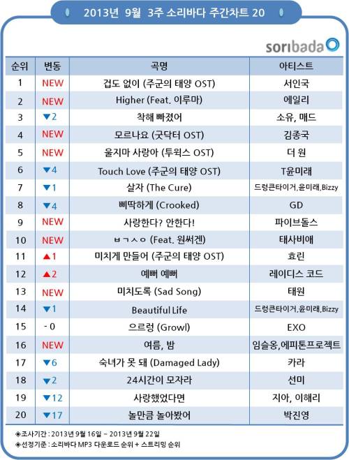 드라마 ‘굿닥터’ OST인 김종국의 ‘모르나요’와 ‘투윅스’ OST인 더 원의 ‘울지마 사랑아’가 나란히 4,5위를 기록했다.