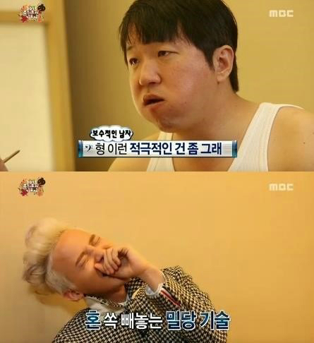 또 정형돈 입가에 음식이 묻을 것을 본 지드래곤이 이를 닦아주려 하자 정형돈은 이를 뿌리치며 "형 적극적인 건 좀 그래"라고 반응해 폭소케 했다.