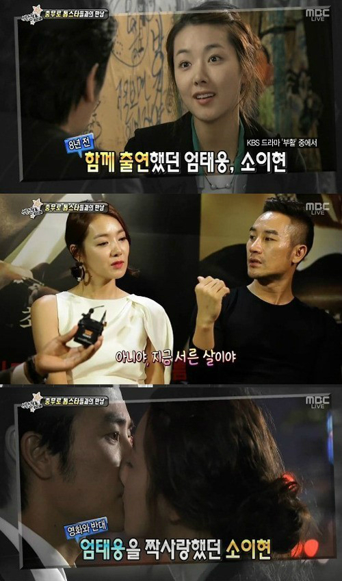 이날 방송에서 엄태웅은 8년 전 소이현과 함께 연인으로 출연했던 드라마에 대해 "그때 22살이었어? 나랑 나이가 비슷해보였다"라고 말해 웃음을 자아냈다. 이어 엄태웅은 "얼굴이 아니라 사람들에 대처하는 모습이나 스태프를 대하는 게 노련했다"라고 덧붙였다.