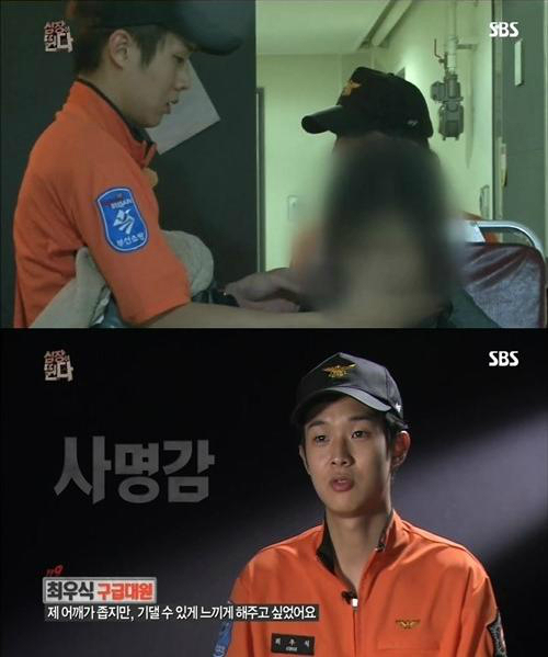 손을 벌벌 떨 정도로 긴장했지만 “너무 차갑나?” 라고 걱정하는 최우식의 모습을 보고 정수경 대원은 “입만 헹구시라고 해라” 라고 대응방법을 조언했다.