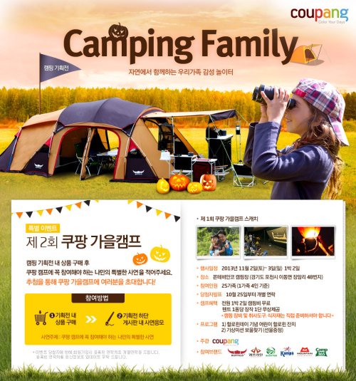 한편, 쿠팡은 고객 대상 이벤트로 ‘제2회 쿠팡 가을캠프’를 진행한다. ‘건전한 캠핑문화 조성 캠페인’의 일환으로 마련한 것으로, 지난 6월 시작한 ‘제1회 쿠팡 가을캠프’에 이어 2회째다. ‘쿠팡 캠핑 기획전 상품’ 구매 후 기획전 하단 게시판에 응모 글을 남기는 고객 중 추첨을 통해 총 25가족을 초청, 오는 11월 2∼3일 1박 2일 일정의 캠핑 이벤트 참여 기회를 제공한다. 응모는 23일까지 가능하며, 자세한 사항은 쿠팡 홈페이지(www.coupang.com)를 참조하면 된다.