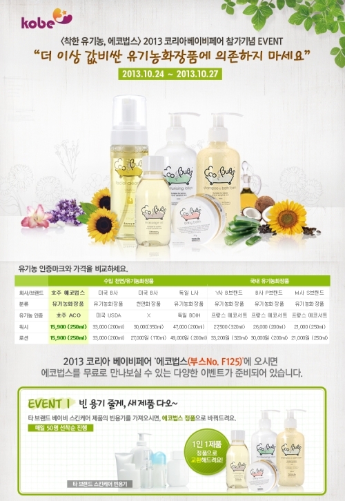 에코법스는 이 밖에도 코리아베이비페어 부스로 방문한 방문객에 한 해 1만개의 샘플 제공, 회원가입 시 100% 트래블킷 증정, 스페셜기프트팩 등의 이벤트도 연다. 자세한 내용은 에코법스 홈페이지(www.ecobubs.co.kr)를 통해 확인할 수 있다.