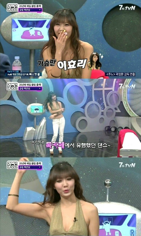 클럽회춘녀는 "어릴 때 별명이 '가슴만 이효리'였다"고 밝히며 겉 옷을 벗어 글래머 몸매를 뽐냈다.