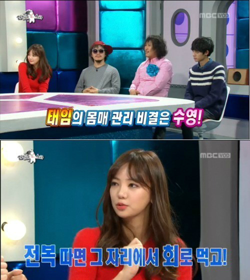 이날 방송에서는 최근 온라인상에서 화제가 된 이태임의 수영복 사진이 공개됐고, 이태임은 자신의 몸매관리 비법을 수영이라고 밝혔다.
