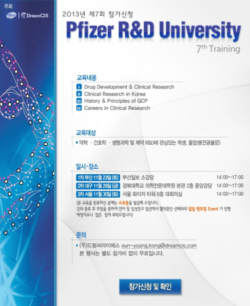 올해로 7회를 맞이하는 ‘화이자 R&D 유니버시티’에서는 의약품 개발과정 및 임상연구, 한국의 임상시험 현황, 의약품 임상시험 관리기준 배경과 원칙 등 의약 R&D에 대한 강의와 더불어 임상시험모니터요원(CRA: Clinical Research Associate), 임상연구코디네이터(CRC: Clinical Research Coordinator) 등 의약R&D에 특화된 직업 소개도 진행될 예정이다.