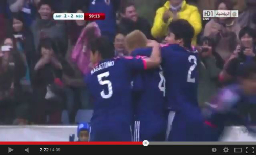 하지만 일본은 그대로 무너지지 않았다. 전반 44분 하세베 마코토(뉘른베르크)의 패스를 오사코 유야(가시마)가 오른발슛으로 연결, 만회골을 넣었다. 기세를 올린 일본은 가가와 신지(맨유)와 엔도 야스히토(감바 오사카)를 투입했고 이후 경기 흐름을 주도했다. 결국 후반 15분 네덜란드 지역에서 세 차례 논스톱 패스로 기회를 만들었고 이를 혼다가 논스톱 슛으로 마무리해 동점을 만들었다.