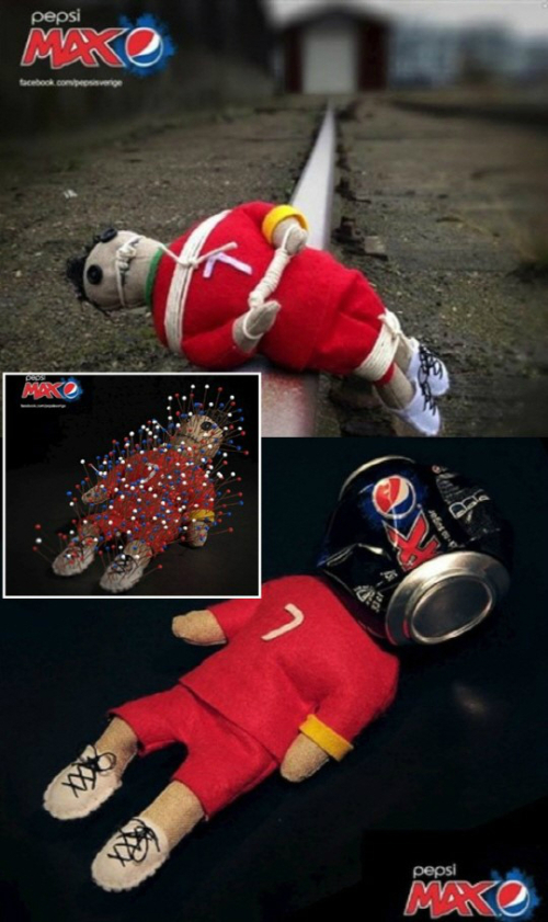 지난 18일 펩시 스웨덴 지사 공식 페이스북에는 '포르투갈을 넘어 스웨덴의 월드컵 진출을 기원한다'며 바늘이 수백개는 찔린 인형 사진, 손이 묶인 인형이 철로 위에 있는 사진, 콜라캔에 얼굴을 강타당한 사진 등이 게재됐다.