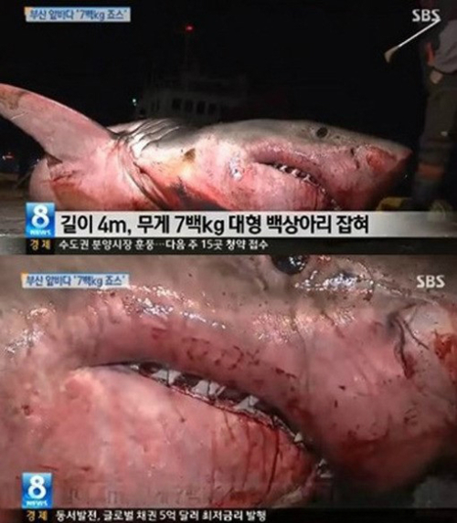 지난 22일 부산 앞바다에서 몸길이 4m 길이에 무게 700kg이 넘는 백상아리 한 마리가 잡혔다. 부산에서 잡힌 4m 길이의 백상아리는 사나운 성격을 가졌으며 그물 속에서 다른 물고기를 잡아먹었다고 전해진다.부산 4m 백상아리를 접한 어민은 한 방송국의 인터뷰에서 “35년 넘게 어시장에 근무하면서 이렇게 큰 상어는 처음”이라고 답했다. 이어 이 백상아리는 경매로 70만 원에 팔렸다.