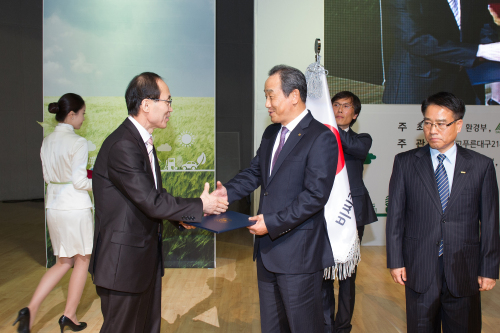 이강태 BC카드 사장이 윤성규(왼쪽) 환경부 장관으로부터 표창을 수여받고 있다.