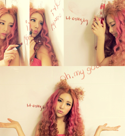 티저 이미지 속 큐리는 고양이를 연상케 하는 핑크색 웨이브 헤어에 엉뚱한 듯한 표정으로 몽환적인 분위기를 풍기고 있다. 또 립스틱을 이용해 신곡 ‘나 어떡해’를 표현했다.