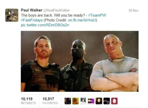 폴워커는 사고 전 “우리가 돌아온다. 준비됐어?”라는 글과 ‘분노의 질주’에 함께 출연한 배우 타이레스 깁슨과 빈 디젤이 함께 모습을 드러낸 사진을 게재했다. 이 사진과 글이 공개되자 수많은 누리꾼들이 안타까운 심경을 전하며 슬퍼하고 있다.