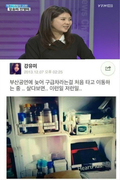 이어 관계자는 "당시 강유미는 부산에서 '드립걸즈' 공연이 있었는데 교통 혼잡 등으로 인해 공연을 하지 못하게 될 위기였다. 퀵서비스를 이용하려 했으나 부산은 지역구간의 이동의 경우 이용이 어렵다고 하더라. 그러다 사설로 운영되는 민간 응급 후송단체가 있다는 것을 알게 돼 부탁드리고 이용한 것"이라고 설명했다.
