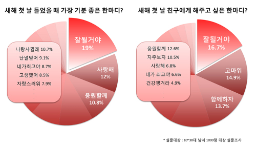 설문조사 결과, 젊은이들이 새해를 맞아 가장 듣고 싶은 말은 사랑의 메시지가 아닌 희망의 메시지로 조사됐다. 10대~30대 성인 남녀는 새해 첫날 들었을 때 가장 기분 좋은 한 마디로 ‘사랑해(12.0%)’보다는 ‘잘 될 거야’(19.0%)를 1위로 꼽았다.