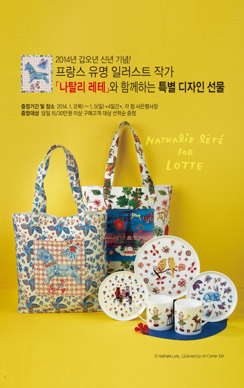 청마해 기념 감사품 증정 행사(사진)는 덤이다. 2∼4일, 당일 15만원 이상 구매 시 프랑스 유명 일러스트 작가 나탈리 레테가 직접 디자인한 ‘청마 에코백’을 선착순 증정하며, 30만원 이상 구매 시 나탈리 레테 디자인의 한국도자기 ‘본 차이나 머그, 접시세트’를 증정한다.