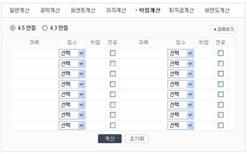 성적계산기는 이른바 학점계산기 서비스로 대학생들의 성적을 일괄적으로 계산해주는 프로그램이다. 과목별 점수와 학점(시수)을 입력하기만 하면 곧바로 평균 평점을 계산해준다. ‘4.3점 만점’과 ‘4.5점 만점’ 두 가지 타입 중 하나를 선택, 과목별 점수를 입력하면 자동적으로 성적을 계산해준다.