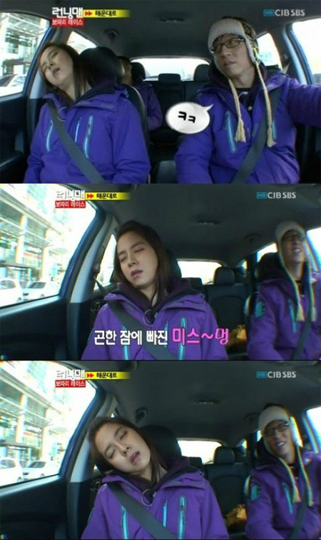 이에 운전석에 앉은 유재석은 입을 벌리며 고개를 떨군 송지효를 보고 웃음지었다. 이날 제작진 역시 ‘낮잠과 사투를 벌이는 미스 멍’이란 자막을 공개했다. 이어 송지효는 꿀잠을 잔 이후 깨어나 “죄송하다”고 밝혔다.
