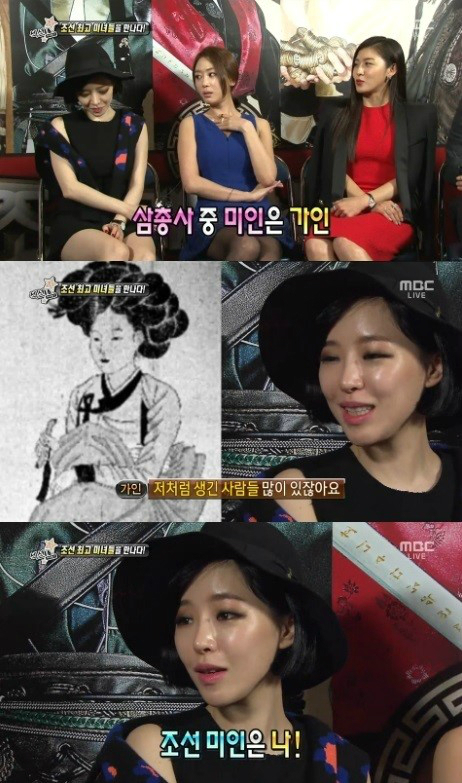 이날 인터뷰에서 '조선 미녀 삼총사' 출연 배우들은 조선 시대 미인으로 가인을 꼽았고 이에 가인은 "조선 시대 그림을 보면 저처럼 생긴 사람이 많이 있다"고 너스레를 떨었다.