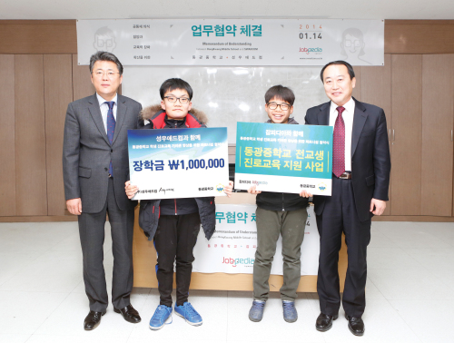 | 이민성 잡피디아 대표와 동광중학교 나원종·이호연 학생, 김동신 교장선생님(왼쪽부터)이 업무협약식 후 포즈를 취하고 있다. |