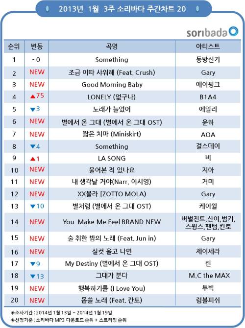 온라인 음원 서비스업체 소리바다(대표 양정환, www.soribada.com)는 동방신기의 ‘Something’이 1월 3주차(1월 13일~1월 19일) 주간차트 1위를 차지했다고 밝혔다.