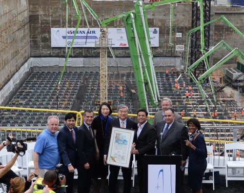특히 15일부터 16일까지 이틀간 윌셔 그랜드 호텔 프로젝트 부지에 투입될 콘크리트의 무게는 총 8200만 파운드(약 4만2930톤)로 레미콘 2120대 분량에 달한다. 이는 세계 최대 규모의 연속 콘크리트 타설로 기네스북에 등재될 예정이다.이번 콘크리트 타설은 지어질 건물의 구조를 튼튼하게 다지기 위해 진행하는 기초 작업으로, 이와 같이 대량의 콘크리트를 일시에 타설하는 이유는 균일하게 콘크리트를 굳힐 수 있어 균열을 방지하고 구조를 튼튼하게 다질 수 있기 때문이다. 또한 2개월까지 소요 예상되는 콘크리트 양생 또한 2주로 대폭 줄일 수 있게 되어 공기를 단축해 효율성 또한 담보할 수 있게 된다.