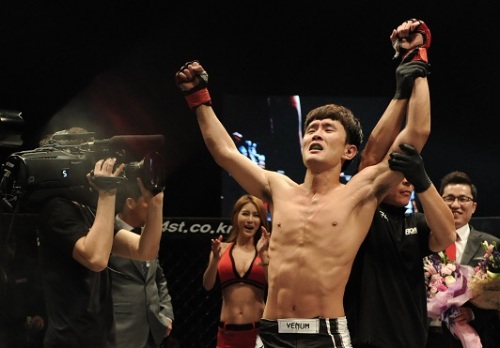 윤형빈은 지난 9일 서울 올림픽 홀에서 열린 로드FC 014 대회에서 일본의 신성 타카야 츠쿠다를 맞아 1라운드 카운터 라이트훅을 적중시켜 프로파이터 데뷔전에서 승리했다. 체육팀 사진 로드FC 제공