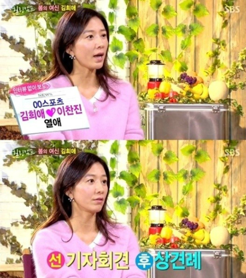 김희애는 이찬진과의 결혼 과정에 대해 "소개 받고 3개월만에 결혼에 골인했다. 스포츠신문에 열애설 기사가 먼저 났다"며 "어쩔 수 없이 기자회견을 먼저 한 뒤 상견례를 했다. 시댁 어른들은 여행 중이셨는데 갑자기 귀국하셨다"고 밝혀 놀라움을 자아냈다.