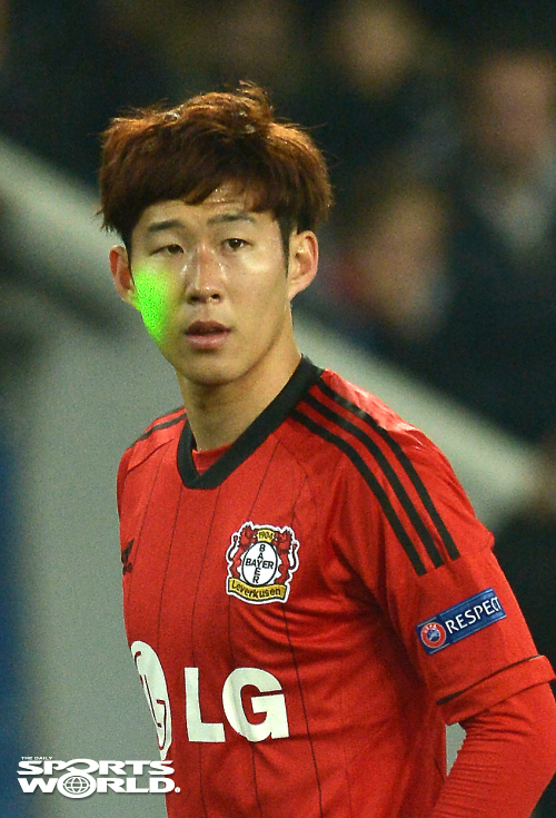 독일 분데스리가 레버쿠젠의 손흥민이 12일 프랑스 파리 Parc des Princes에서 열린 2013-2014 UEFA Champions League 16강 2차전 프랑스 리그앙 파리 생제르맹과의 경기에서 프리킥을 차기 전 파리 생제르맹의 팬들로부터 눈에 레이저 공격을 받고 있다. Parc des Princes(프랑스)=김재원 기자