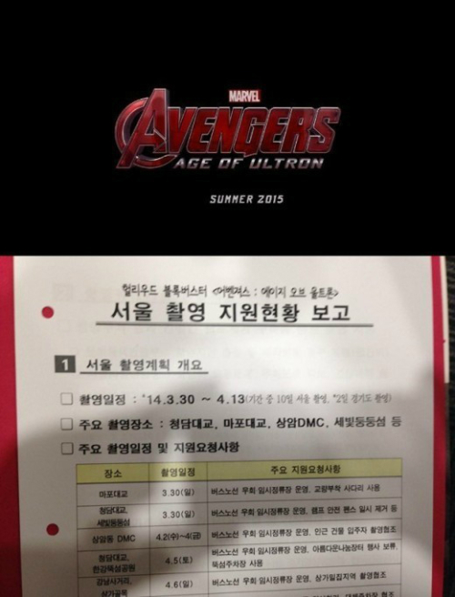 또한 박 시장은 해당 글과 함께 서울 촬영 지원현황 보고 내용이 담긴 한 장의 사진을 게재했다. 공개된 사진에는 '어벤져스2'의 서울 촬영 세부 스케줄이 담겨 있다.