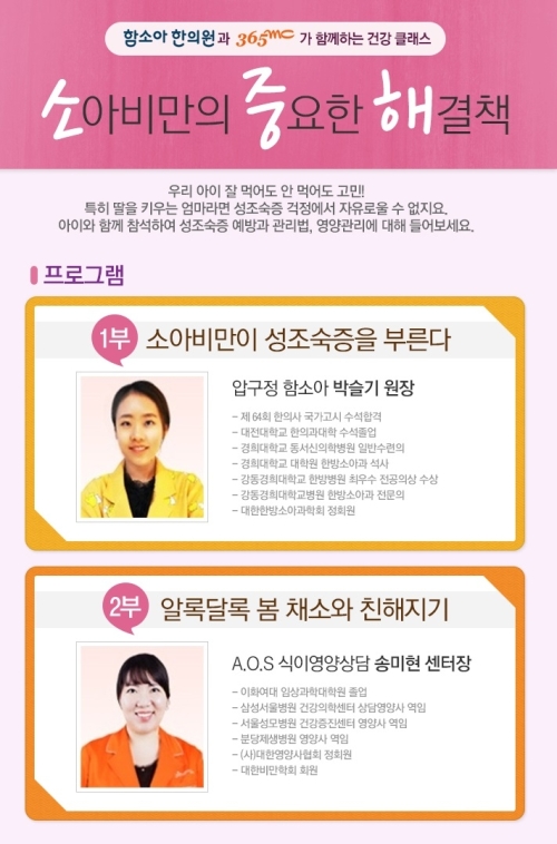 강좌는 3월 26일 오후 4시 서초구 서울365mc위밴드병원 오렌지홀에서 개최되며, 압구정 함소아한의원 박슬기 원장과 서울 365mc 송미현 식이영양상담센터장이 강사로 나선다.