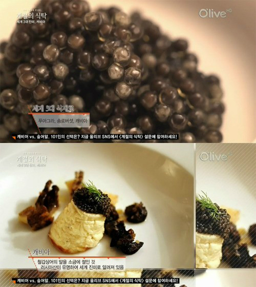 마지막으로 캐비아는 철갑상어의 알을 소금에 절인 것으로, 생산량이 적다보니 비싼 가격으로 거래되고 있으며 벨루가, 오세트라, 세브루가 상어의 알로 구분된다. 또한 종류에 따라 가격과 맛이 큰 차이가 나며 샴페인과 함께 곁들었을 때 좋은 조합을 자랑한다.