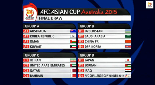 아시아축구연맹(AFC)은 26일(한국시간) 호주 시드니 오페라하우스에서 ‘2015 AFC 아시안컵’ 조추첨식을 열었다. 이날 조추첨에서 한국은 개최국 호주를 비롯하여 오만, 쿠웨이트와 A조에 속했다. 첫 경기인 오만전은 2015년 1월10일 캔버라 스타디움에서 열린다. 13일 같은 장소에서 쿠웨이트를 상대한 뒤, 17일 브리즈번 스타디움에서 호주와 조별리그 마지막 경기를 치른다.