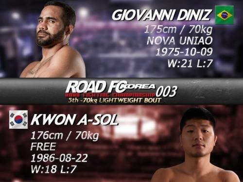 권아솔이 승리했다. 권아솔은 지난 6일 서울 양재동 더케이서울 호텔에서 열린 ‘로드FC 코리아3’ 메인이벤트 경기에서 지오반니 디니즈(브라질)를 3라운드 2분47초 만에 리어네이키드 초크로 서브미션 승리를 따냈다.