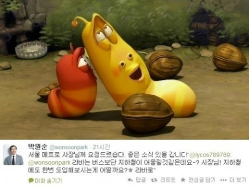 박원순 서울시장은 7일 “뽀로로를 위해서도 뭔가 해 볼 생각이다”라며 “서울메트로 사장에게 ‘라바 지하철’에 대해 요청했으니 좋은 소식이 있을 것이다”라고 트위터에 게재했다.